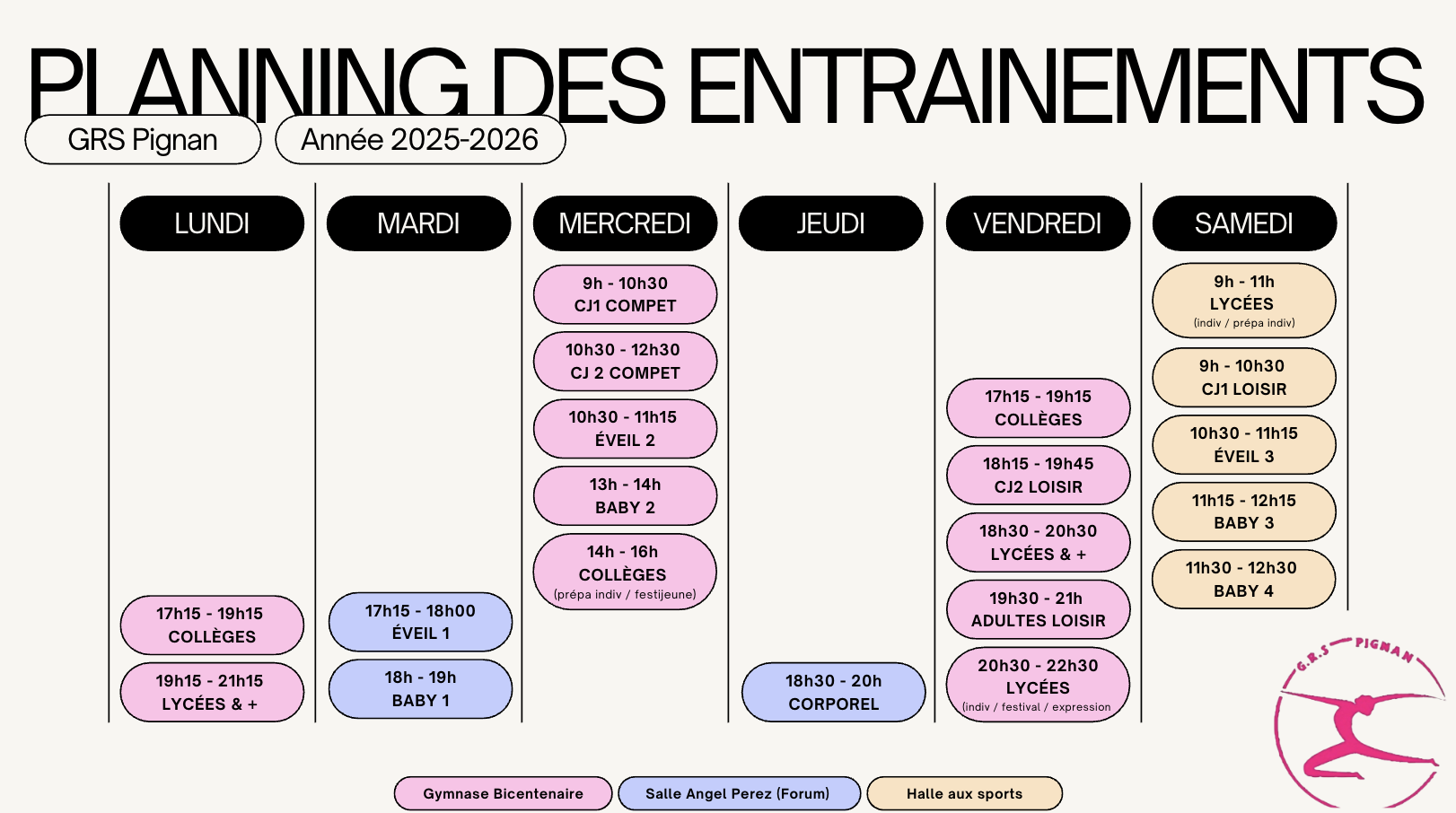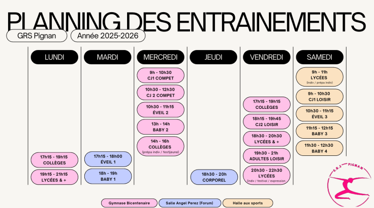 Veillez à bien choisir votre créneau en fonction de l’âge de votre enfant, les compétitions ou non. En cas de doutes n’hésitez pas à nous contacter par email à grspignan@gmail.com